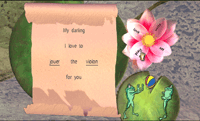 The letter is almost done. Freddy has taken the trouble to underline the words he doesnt know in the second language. He has also scribbled a few suggestions on the leaves of a nearby water lily. Among the four petals, the player must choose the one that displays the equivalent French or Spanish word to the word underlined in Freddys letter. The player obtains a clue by bringing the mouse pointer over each petal. To select a petal, click on it and drag it over the underlined word. To confirm whether this word is correct, Freddy reads the sentence out loud in the second language. Luckily, his poem isnt too long. |
