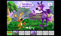 The Visio2000 contains the images of a story. The problem is that the images are not in order. The player must place the images of the tale in chronological order. The images can be examined one by one by clicking on the white arrows. When the player thinks he has found the first image of the story, he simply clicks in the centre of the image and drags it into slot number 1. Similarly, each image has to be inserted into the right slot. Finally, to check whether the images are in the correct order, the player clicks on the check icon. If they are, the animation of the reconstituted story gets under way. |